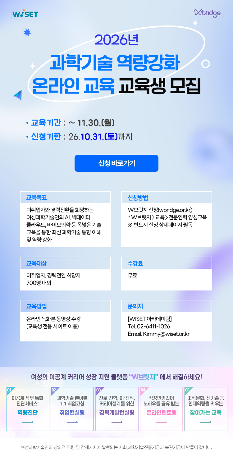 한국여성과학기술인육성재단은 여성과학기술인의 과학기술 역량을 강화하고 최신 기술 트렌드 및 산업 변화에 대한 이해도를 높일 수 있도록 온라인 역량 강화 교육을 마련하였으니 많은 신청 바랍니다.
