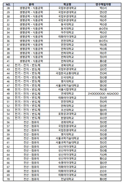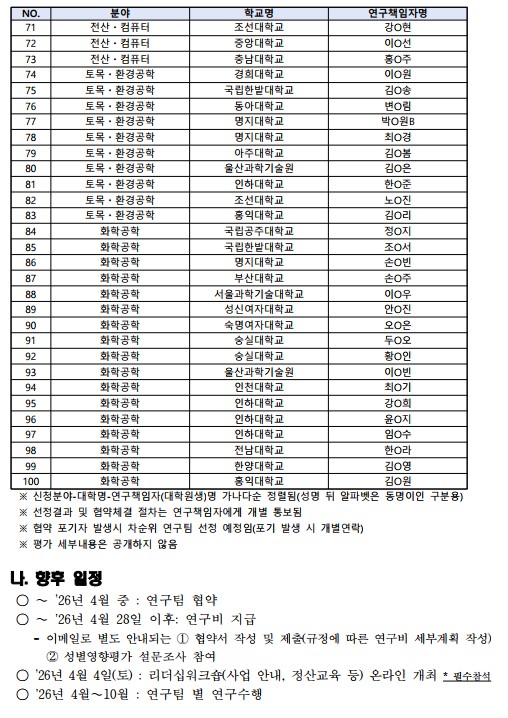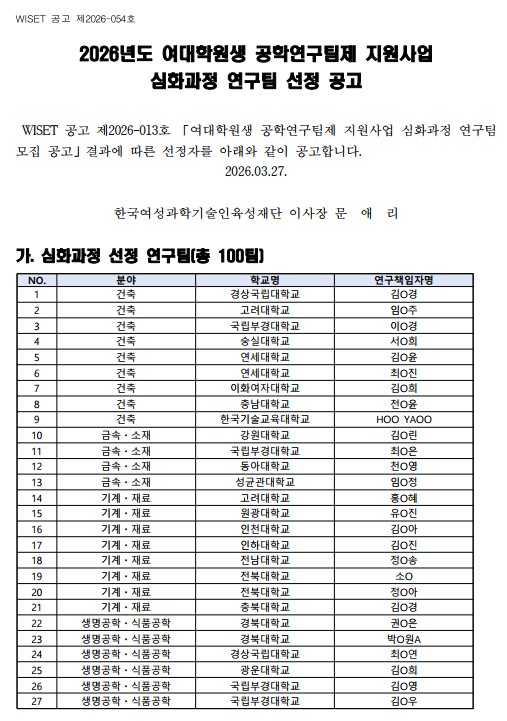 2026년 여대학원생 공학연구팀제 지원사업 심화과정 선정자 공고