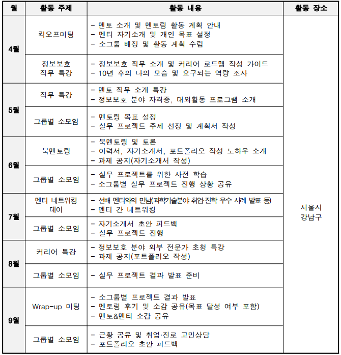 - 보안 컨설팅, 모의해킹, 디지털 포렌식, 개인정보 등 정보보호 세부 분야의 현직자 멘토 경험 공유